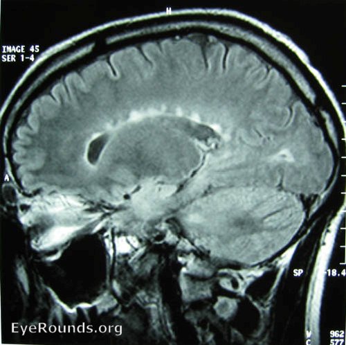 MRI of a patient with multiple sclerosis showing periventricular white matter lesions in the corpus callosum. Despite their size, such lesions are often asymptomatic and may be discovered incidentally.